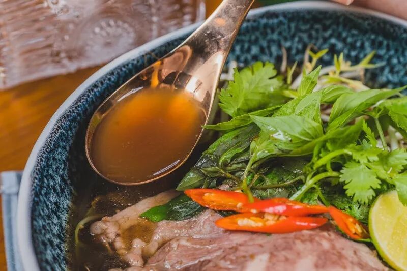 汤底延伸泰国当地做法再加上老板个人的经验进一步改良所得,上桌后即将汤底浇在面上。