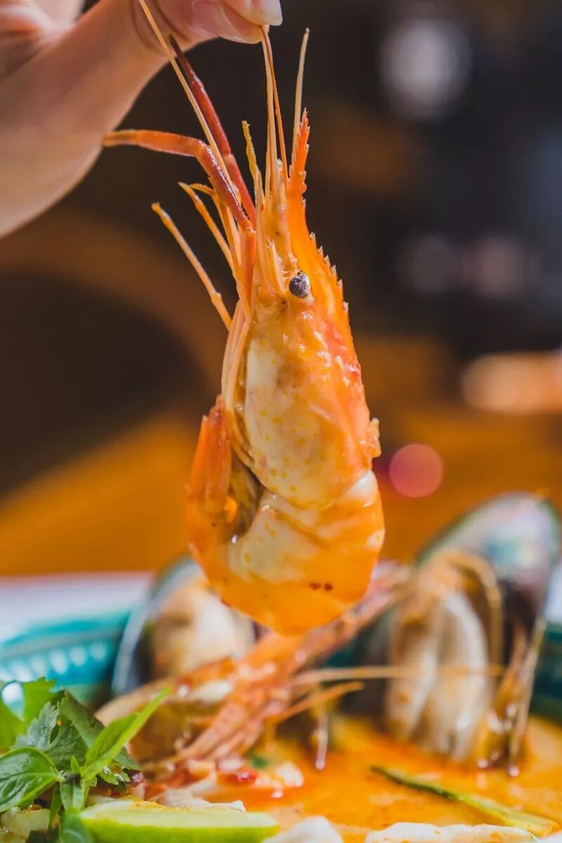 汤底用了新鲜的虾熬制而成,加上香茅,南姜,柠檬叶,柠檬汁,浓郁的香味,酸与辣,对味蕾的挑战。