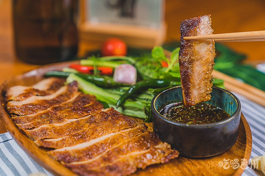 每份烤猪颈肉旁都会搭配圣女果、青瓜、薄荷叶等给客人,膳食搭配一起吃,这让猪颈肉吃起来清香又解腻。
