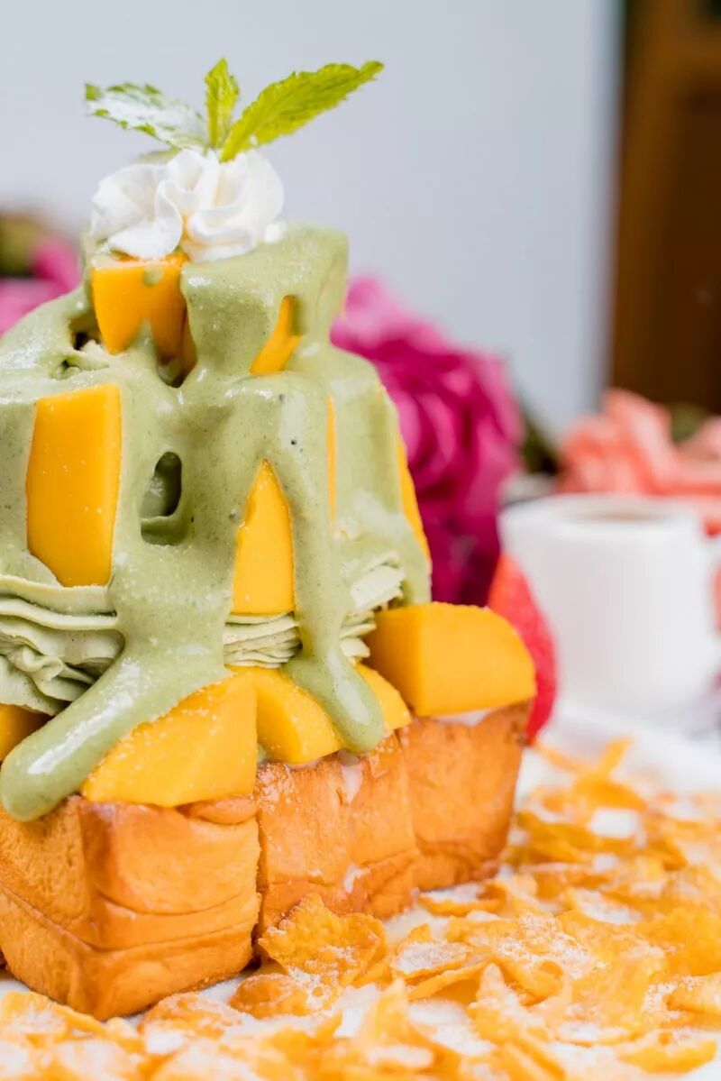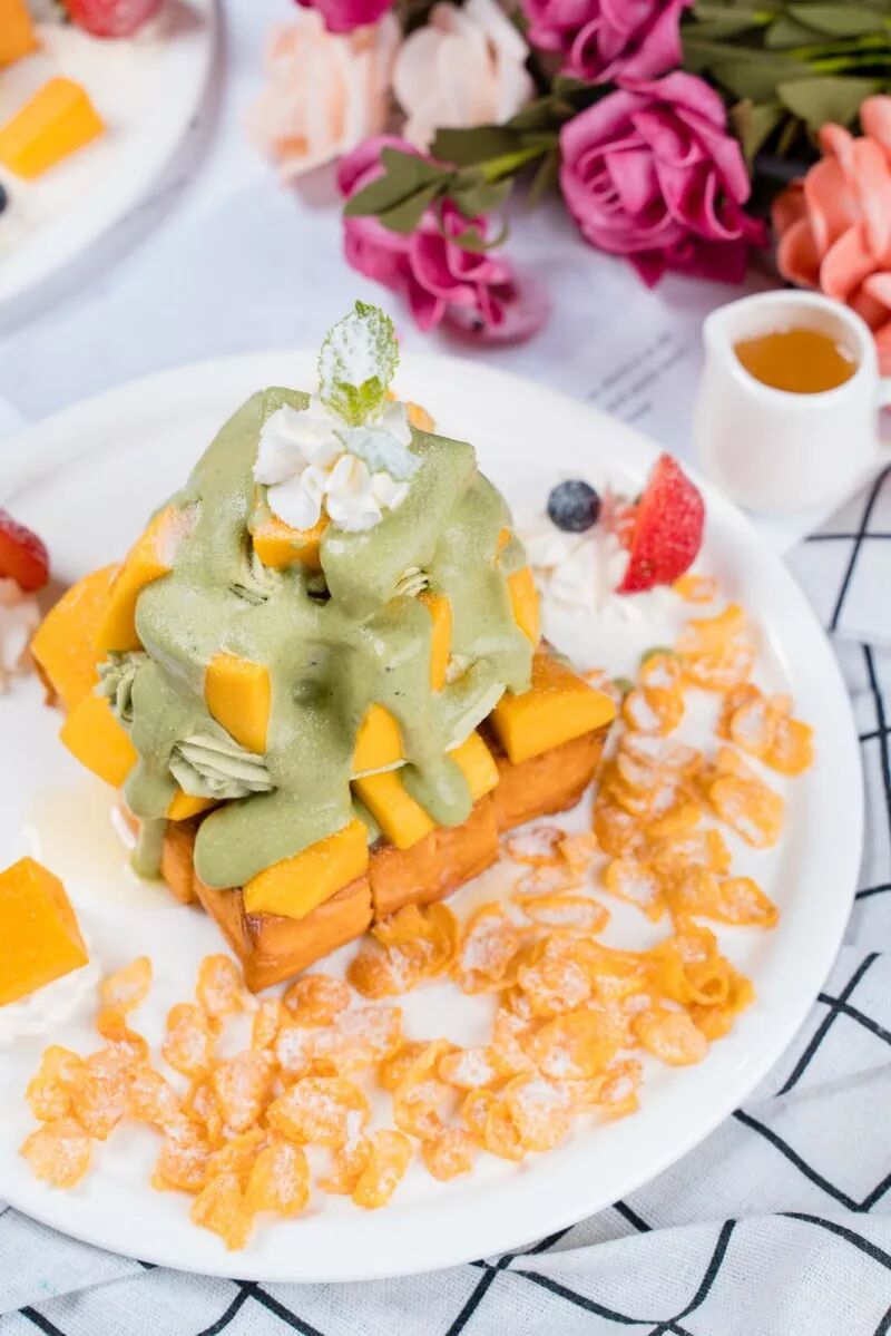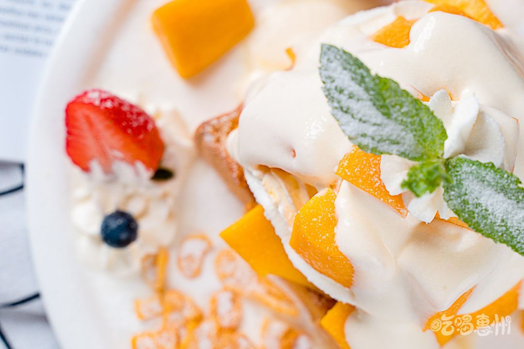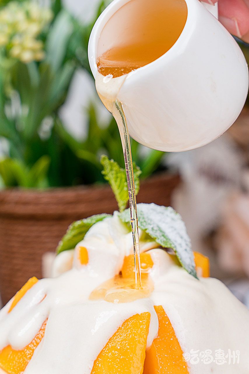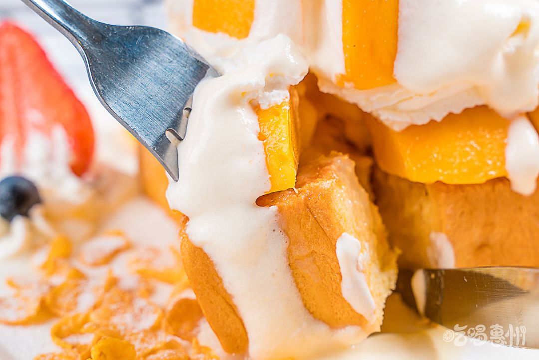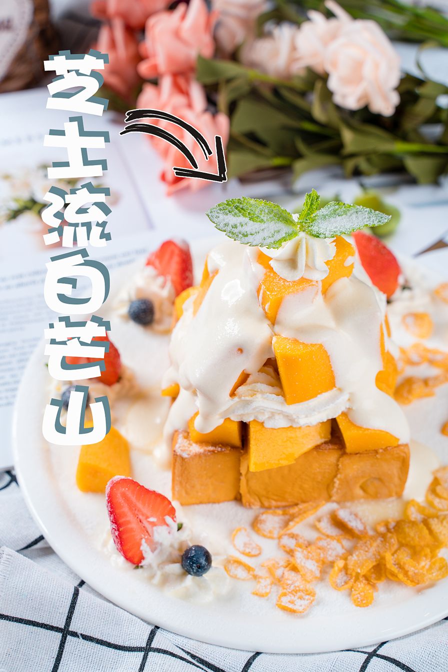香甜绵密的冰淇淋淋在用芒果堆起来的吐司上,是这款让人看着心甜甜的芝士流白芒山。