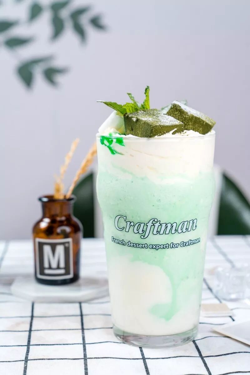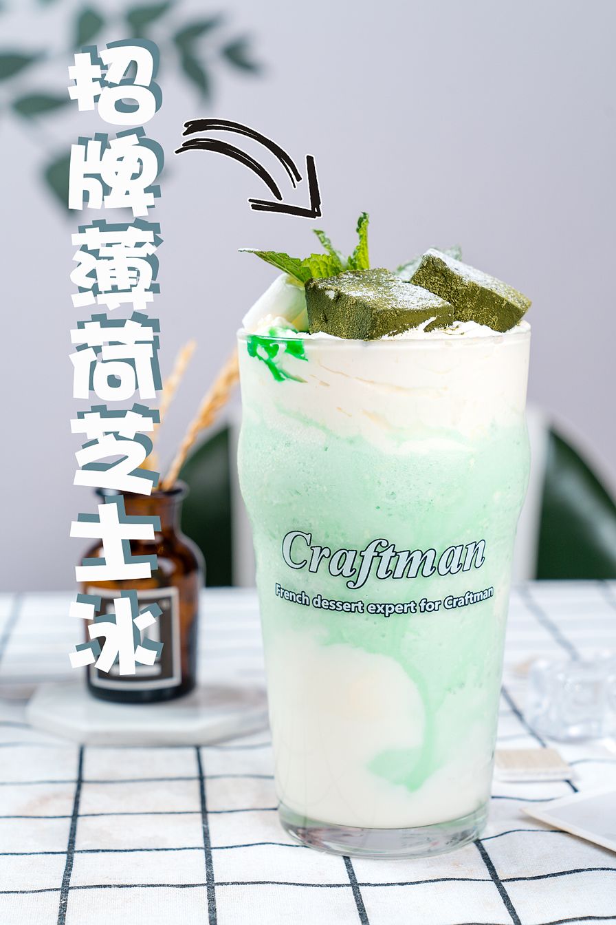完美攻破炎热夏日的这杯招牌薄荷芝士冰,第一眼会被它顶部的芝士块和棉花糖撩到。完美解暑?我会先来一杯!