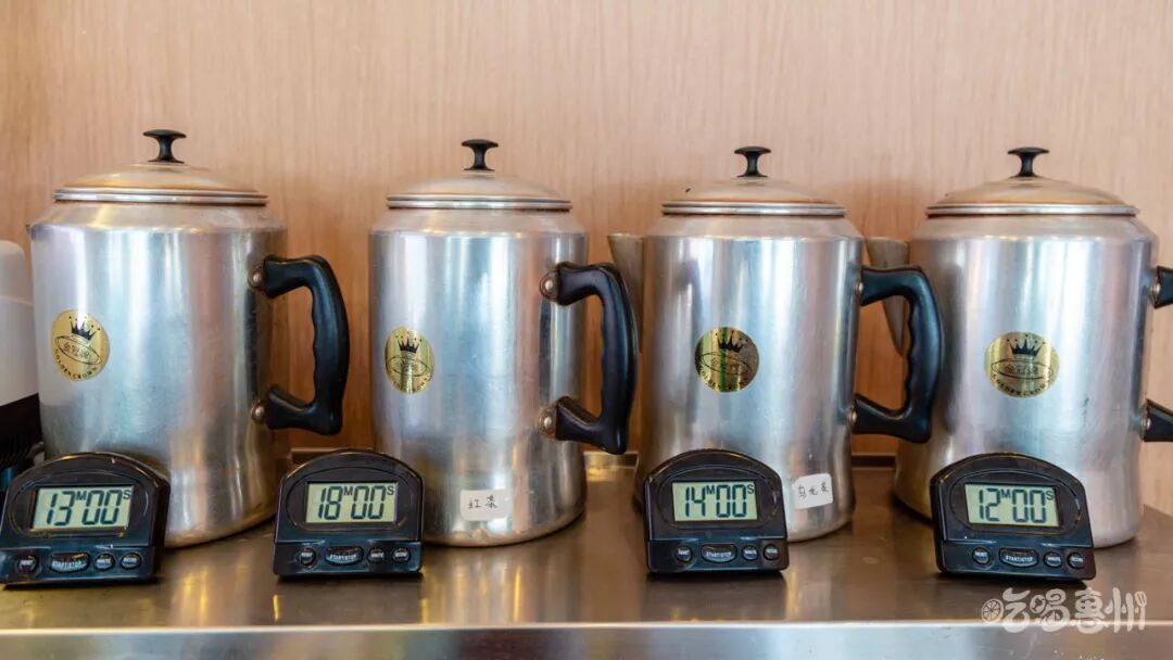 更夸张的是,每款煮茶壶前面都配备一个计时器,因为不同茶叶煮茶时间完全不一样。为了煮出好茶底,“事很多”的店长甚至还会用温度计试好水温,再放茶叶去煮。