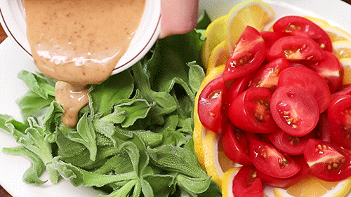 柠檬片摆成花朵盛开的模样,包裹着一颗颗切好的圣女果,卖相满分。撒上香气十足的芝麻沙拉酱,清爽又解腻。炎热的天气吃上这样一盘沙拉,再适合不过了。