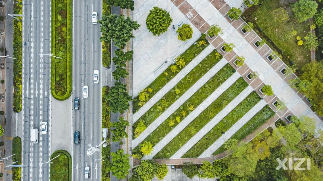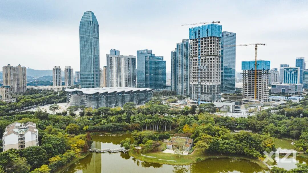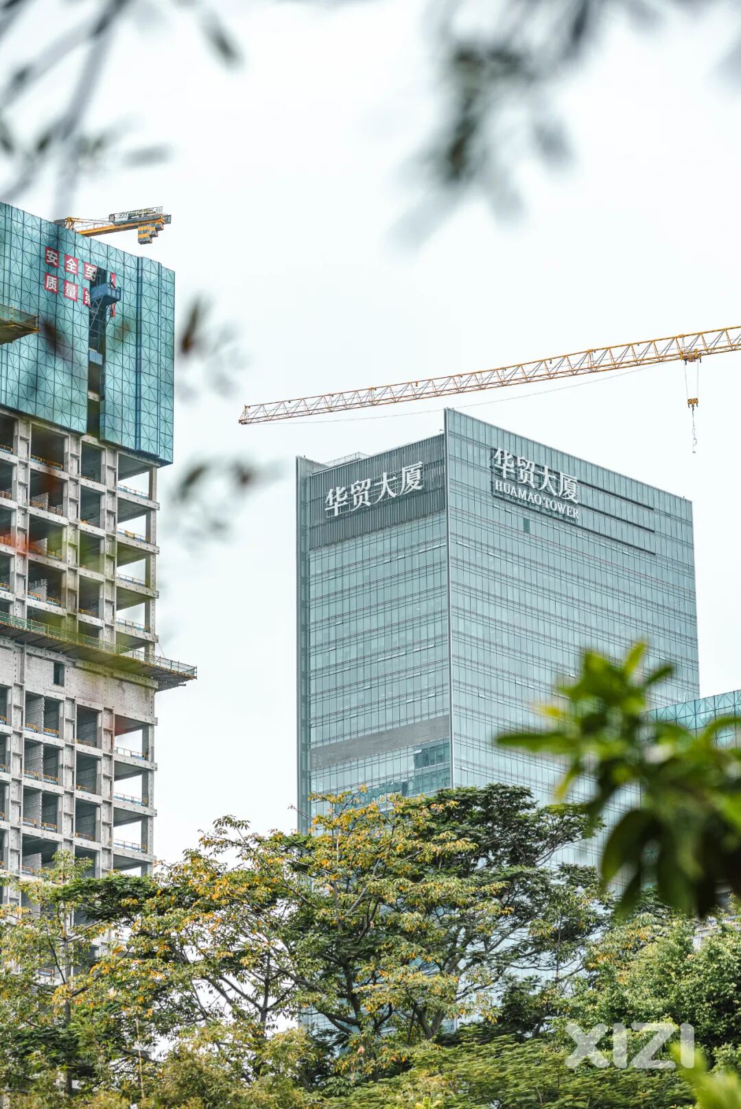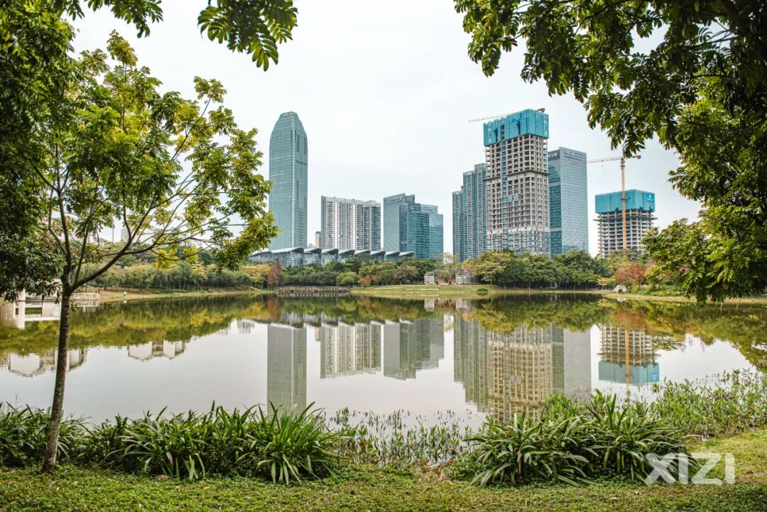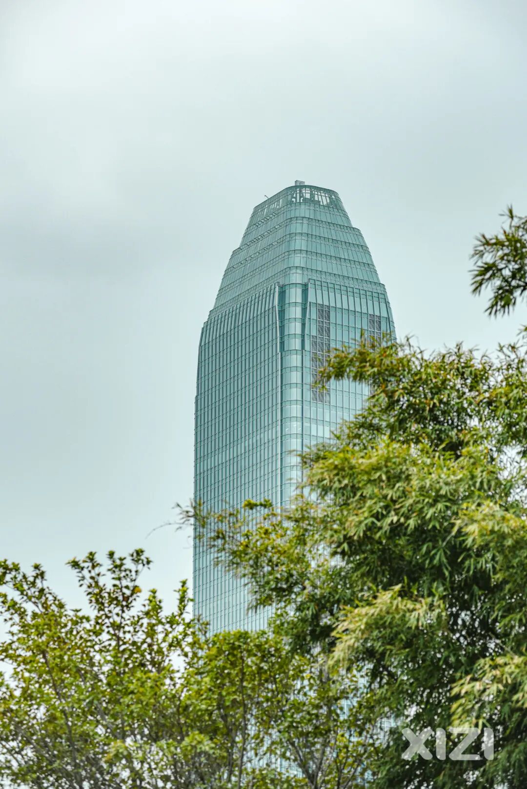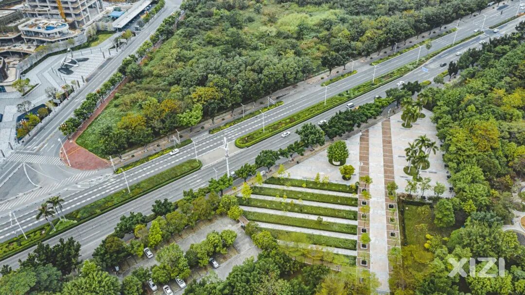 在树林间隙,林立的大厦尽收眼底,周围场馆众多。