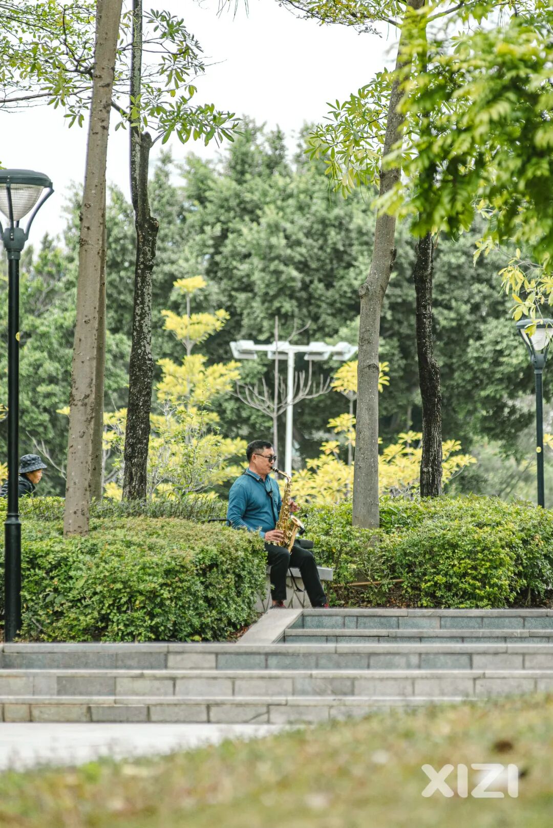公园里设有供游人休息的石凳,去的当天,还有人在一旁吹萨克斯风。