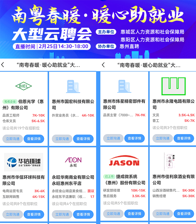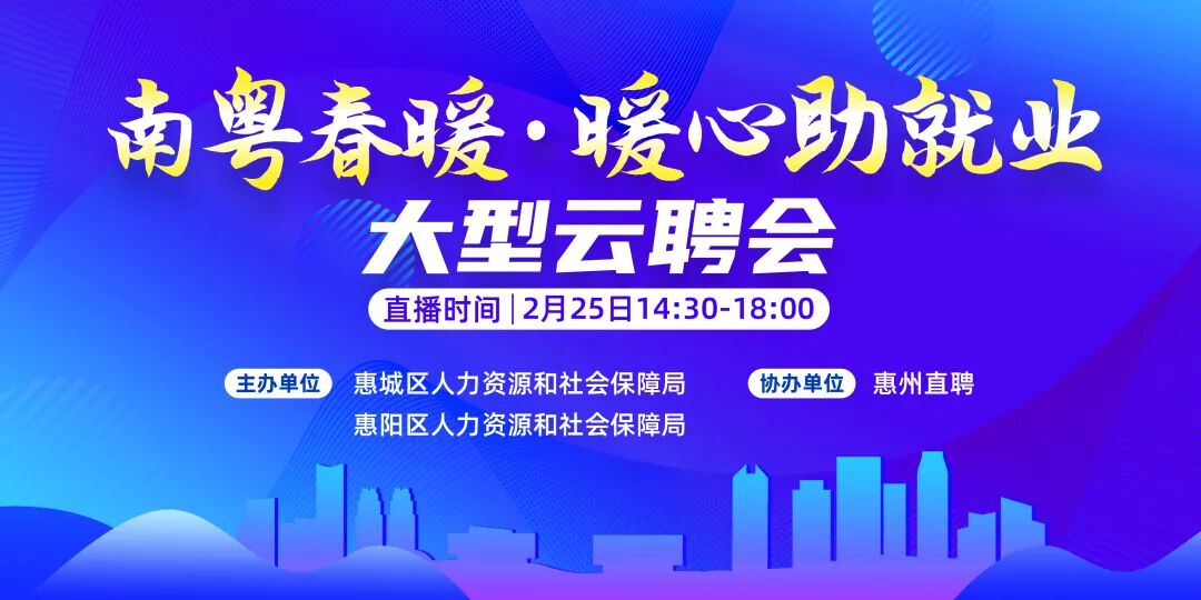 为推进常态化疫情防控与线上线下招聘等就业服务活动,为劳动者求职就业和用人单位用工招聘搭建人力资源供需平台,促进市场对接匹配,帮助企业招到人才、求职者找到一份好工作。惠城区人力资源和社会保障局、惠阳区人力资源和社会保障局联合开展2022年“南粤春暖·暖心助就业”大型云聘会活动。