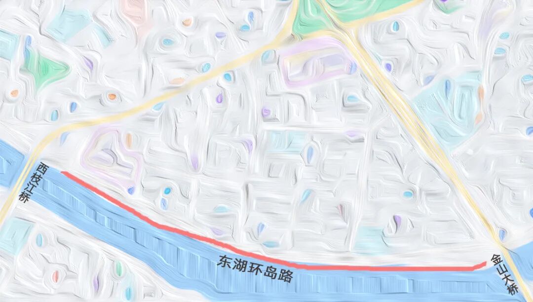 西起隆生广场东湖店,东至金山大桥东湖段,这条由东湖路+东湖辅路组成的道路,便是本期游览地。因其环绕东平半岛东湖路段,亦可称之为「东湖环岛路」。