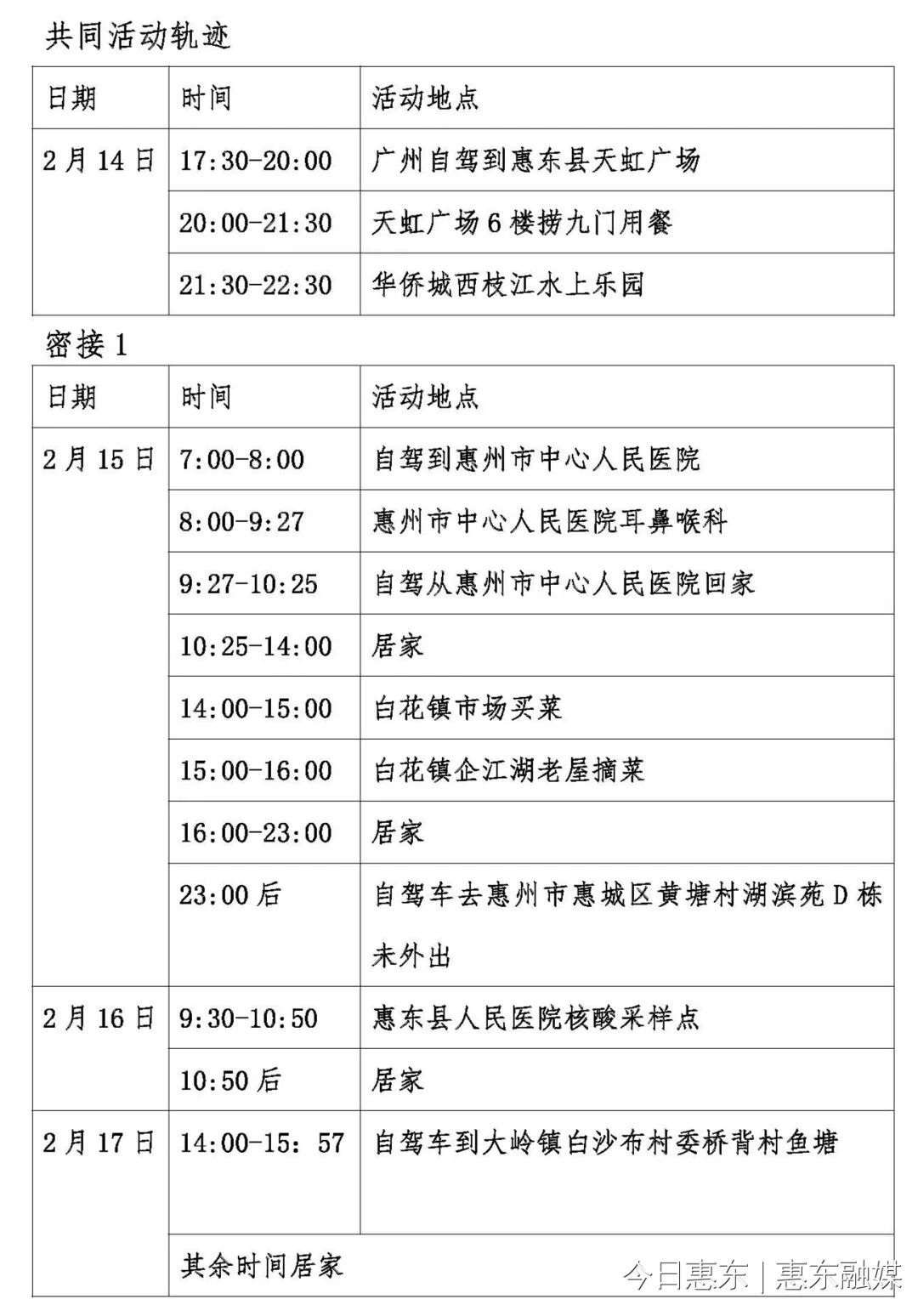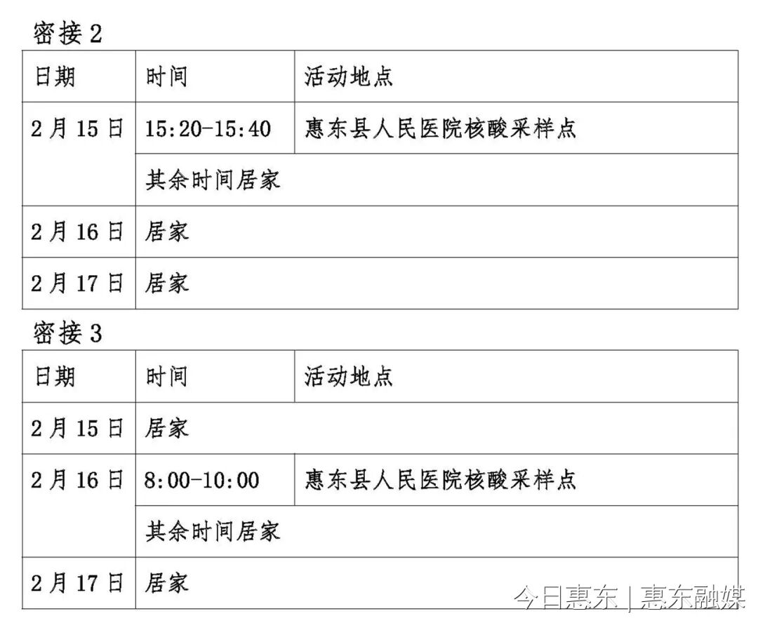 惠东通报多名密接者行动轨迹,请与密切接触者有在同一场合、同一时段有交集或接触的人员,主动向所在社区(村)报备,并配合落实好核酸检测、隔离医学观察、健康监测等疫情防控措施。